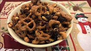 Preheat oven to 300. Prepare a baking sheet with cooking spray; set aside. In a mixing bowl, combine cashews, peanuts, pretzels, and cranberries. In a smaller bowl, whisk egg whites until foamy. Pour over mixture in bowl. In another small bowl, combine sugar, pumpkin pie spice, and salt, Mix well and add to mixture in bowl. Mix until all is coated. Place coated mixture onto prepared baking sheet. Bake one hour, stirring every 15 minutes. Let set to cool completely.